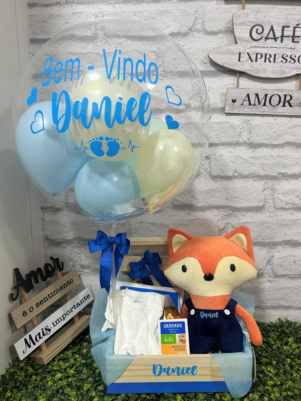 CESTA NATERNIDADE BEM-VINDO   CESTA DE CAFÉ DA MANHÃ BOMBOCADO COM BALÕES E PÃO FRANCES
