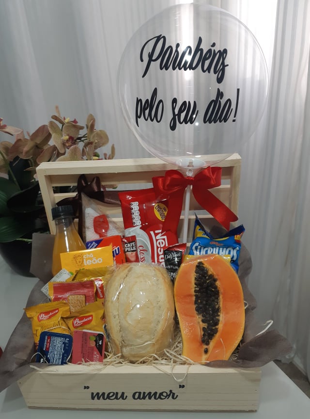 CESTA DE CAFÉ DA MANHÃ BELISSIMA MANHÃ   BALÃO BUBBLE PEQUENO PARABENS PELO SEU DIA