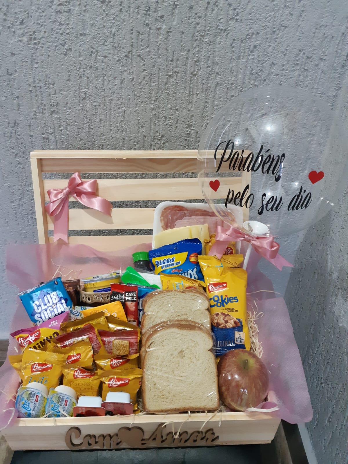 CESTA DE CAFÉ DA MANHÃ ADORO VC COM BALÃO BUBBLE PEQUENO   PAO DE LEITE
