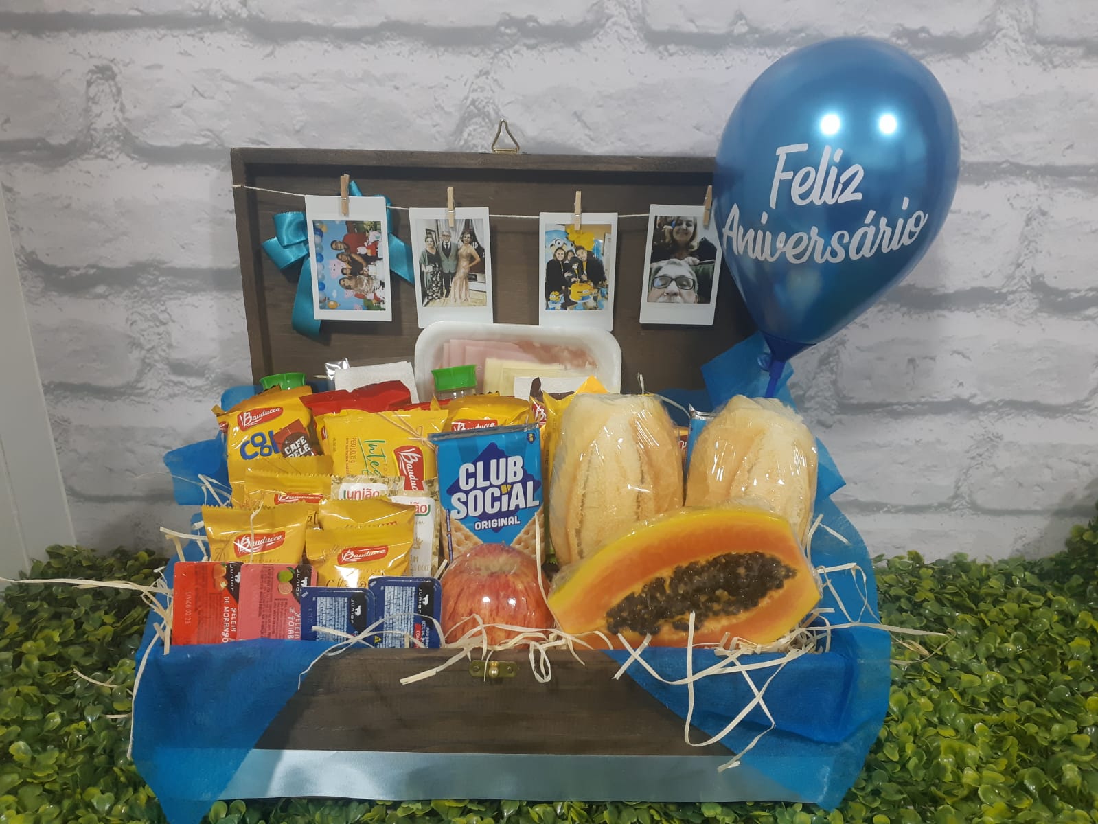 CESTA DE CAFÉ DA TARDE SURPRESA COM FOTOS   BALÃO BUBBLE MEDIO FELIZ ANIVERSARIO