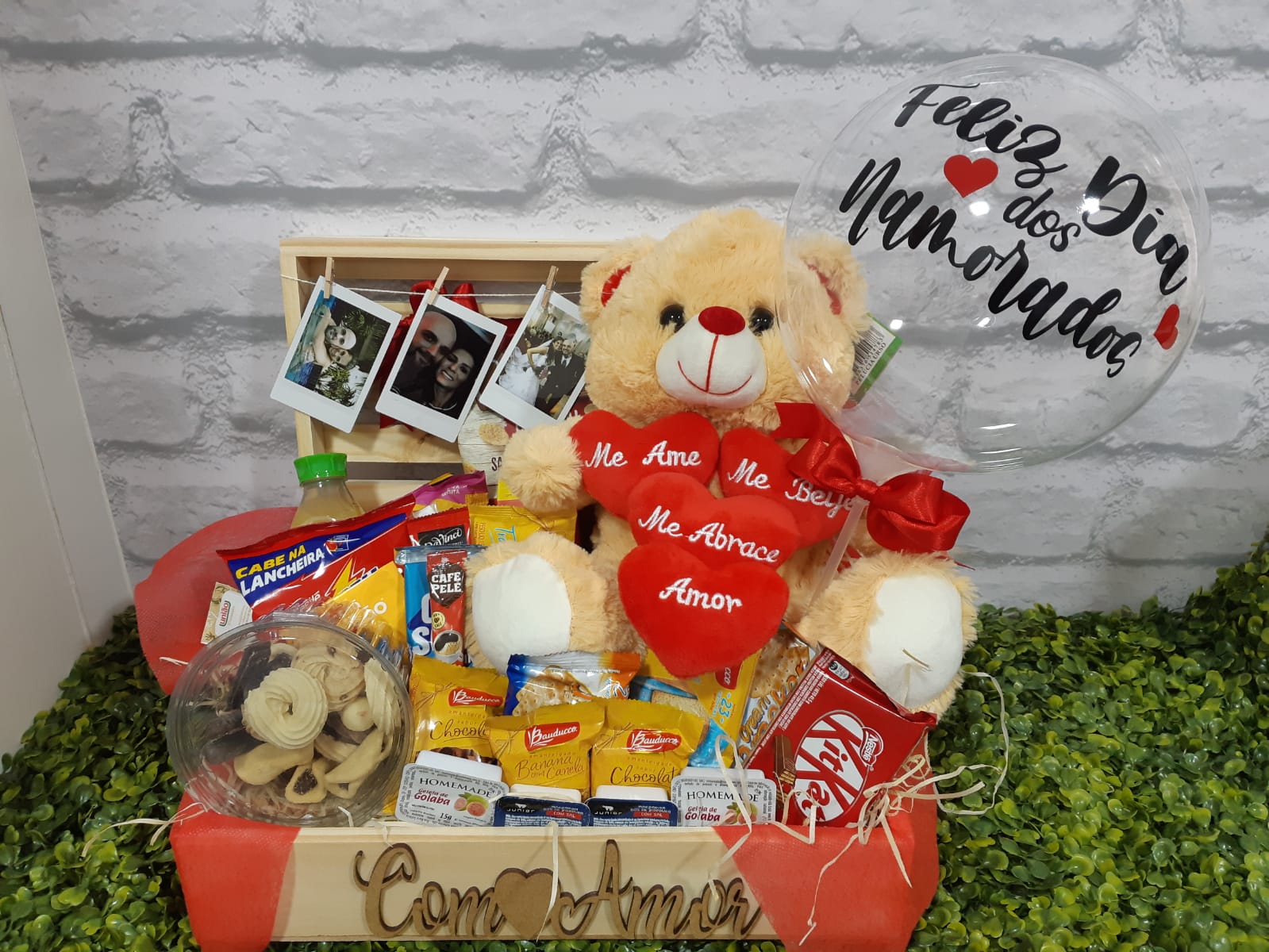 Que Lindo... Um maravilhoso baú em madeira, repleto de deliciosos produtos, acompanhada de um belissimo urso de pelúcia com os dizeres Apaixonantes