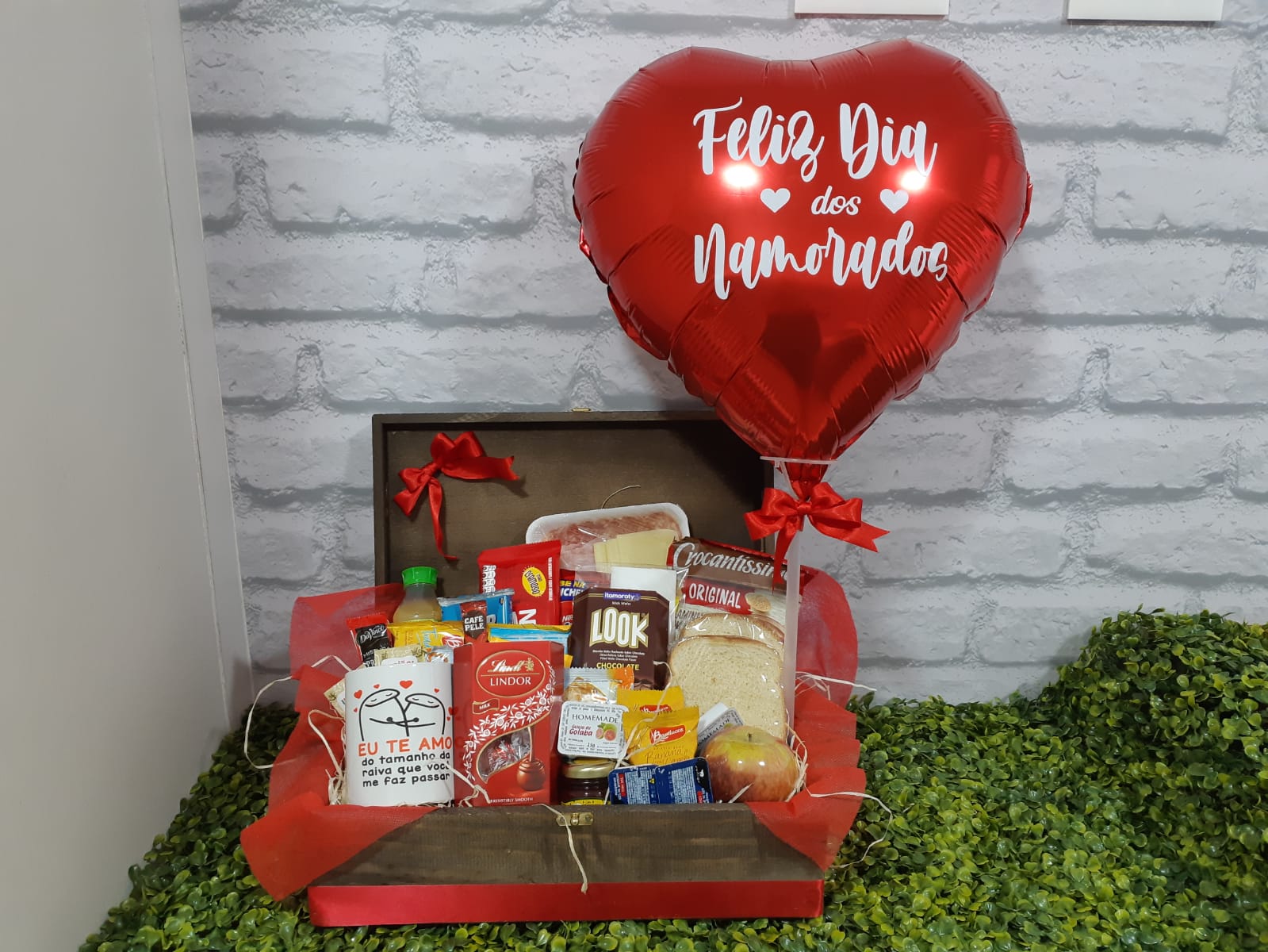 CESTA DE DIA DOS NAMORADOS COM CANECA FLORK E BALÃO   CESTA DE CAFÉ DA MANHÃ TUDO CONTINUA LINDO