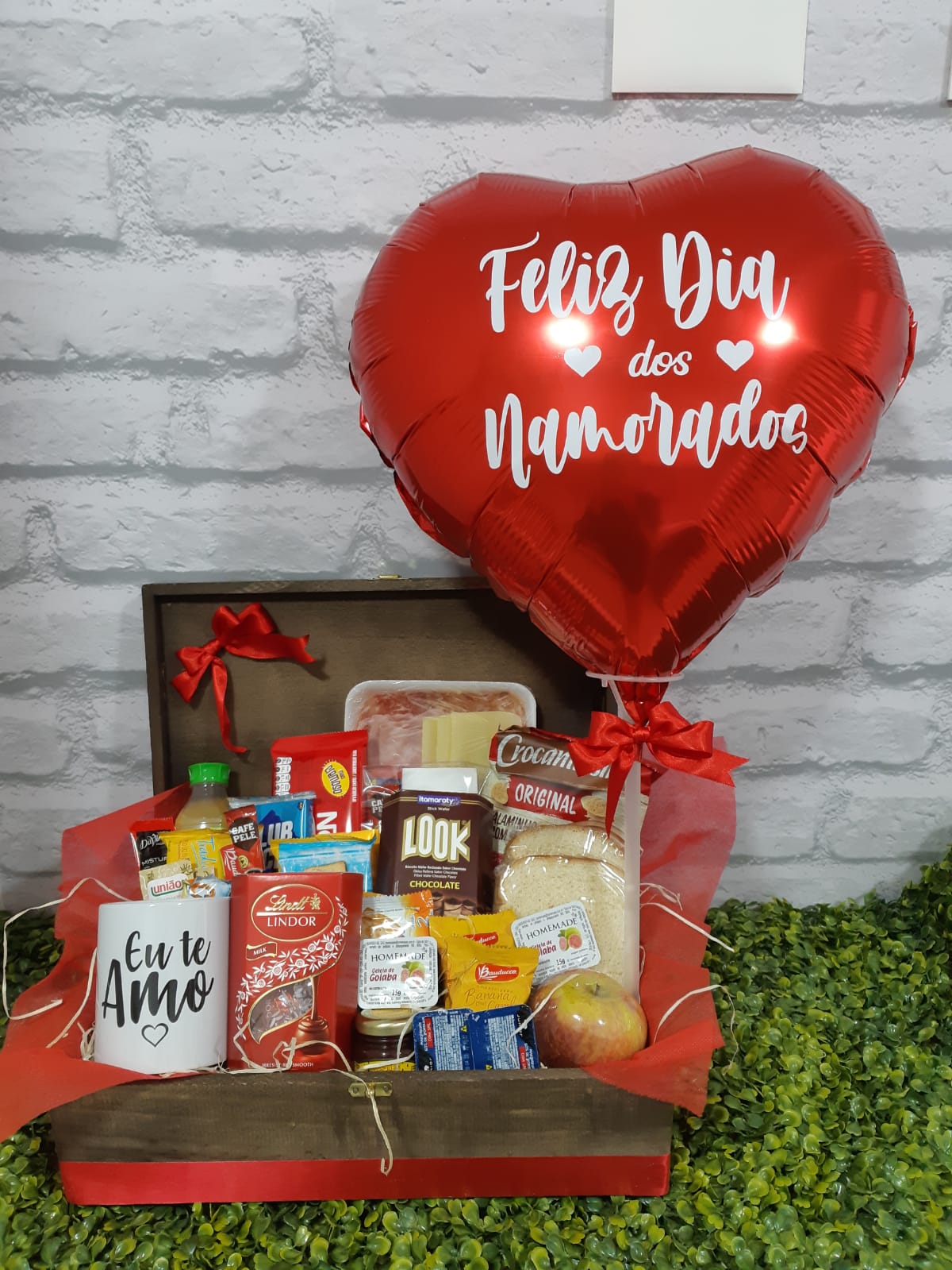 CESTA DE DIA DOS NAMORADOS O MELHOR NAMORO DO MUNDO CANECA E   BALÃO METALIZADO GRANDE CORAÇÃO EU TE AMO