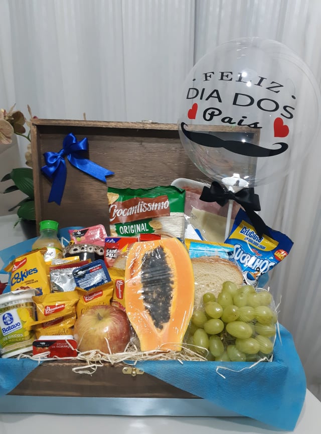 Um sofisticado café da manhã em um refinado baú em madeira para você presentear a pessoa querida....