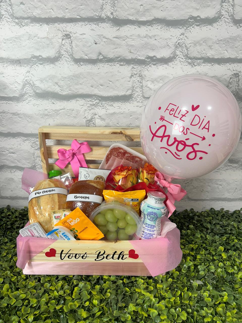 CESTA DE CAFÉ DE DIA DOS AVÓS CALIFORNIA COM BALÃO   CESTA DE CAFÉ DA MANHÃ BUENOS DIAS COM FOTO E BALÃO