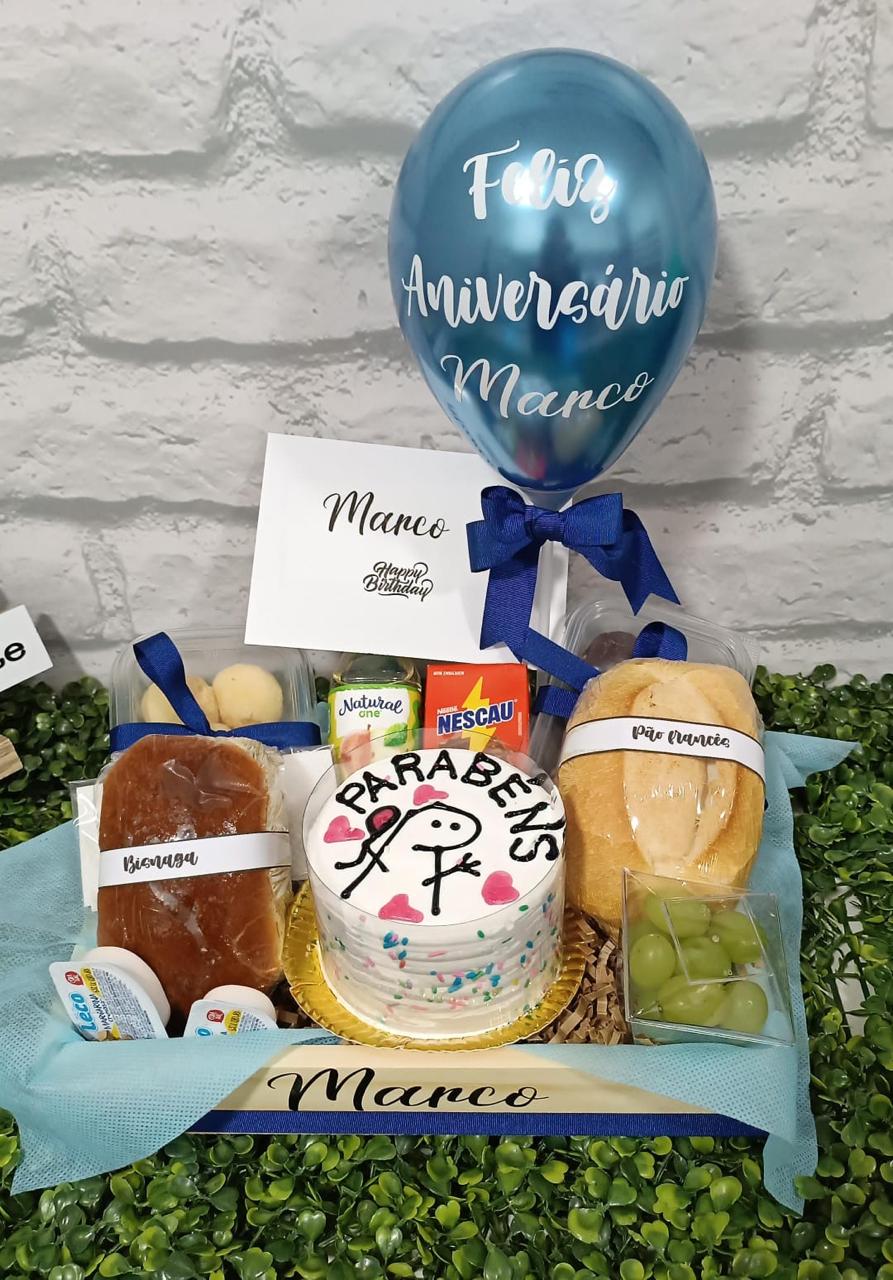 CESTA DE CAFÉ DA MANHÃ CESTO DE PÃO COM BOLO   CESTA DE ANIVERSÁRIO ACREDITE NOS SEUS SONHOS NO AZUL