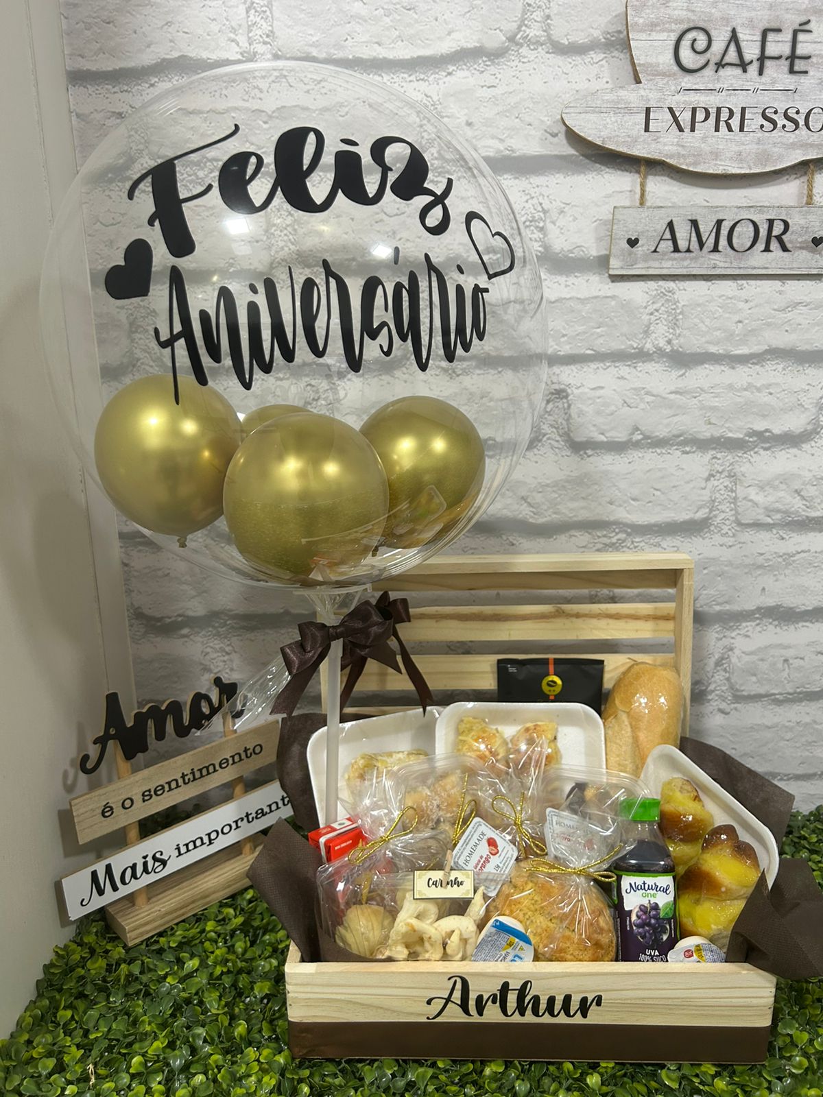 CESTA DE CAFÉ DA MANHÃ BELLA LUNA   CESTA DE CAFÉ DA MANHÃ CAFEZÃO COM ARRANJO DE ROSAS E BALÃO