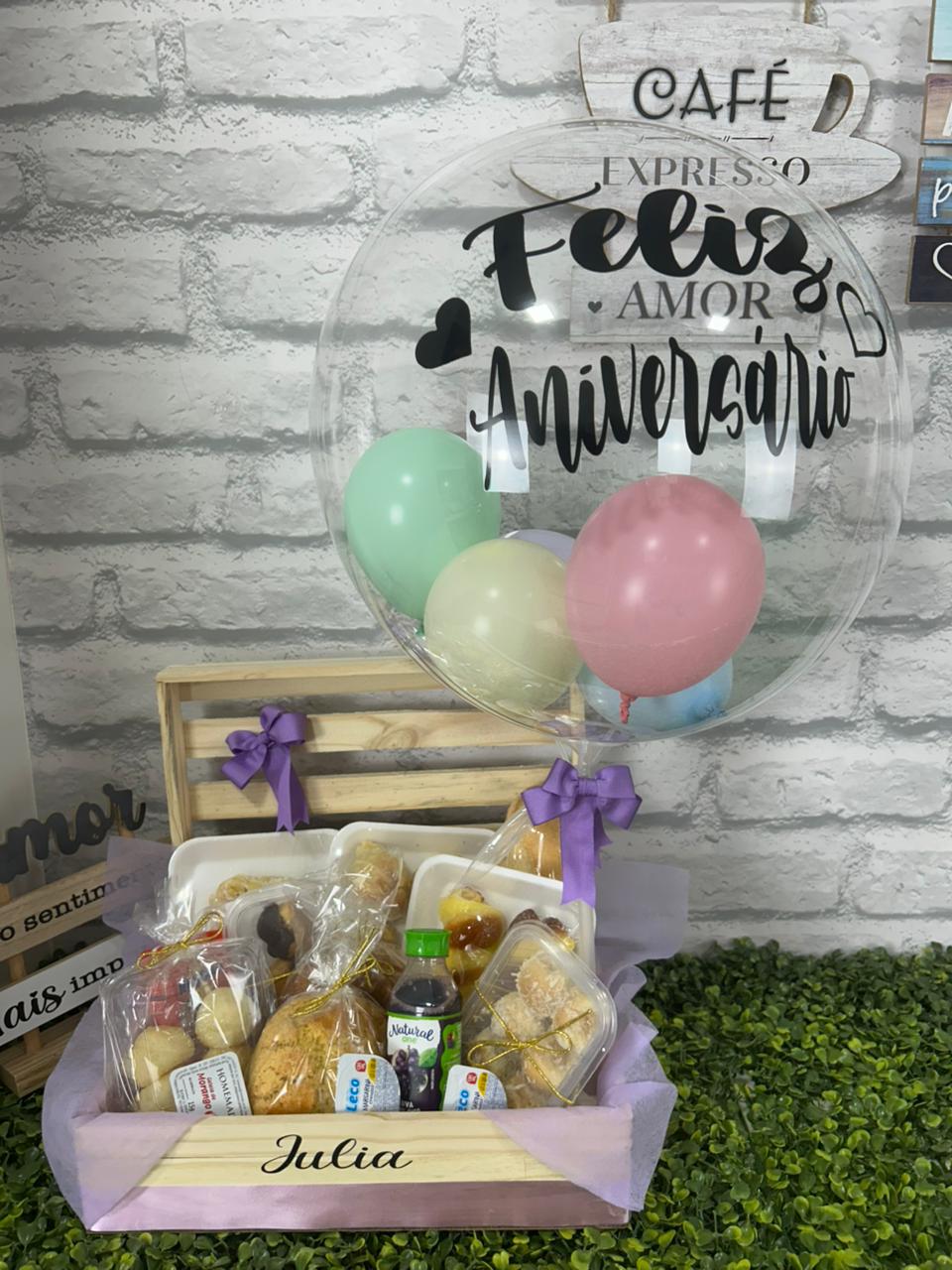 CESTA DE CAFÉ DA MANHÃ BELLA LUNA LILAS   CESTA DE CAFÉ DA MANHÃ BUENOS DIAS COM FOTO E BALÃO